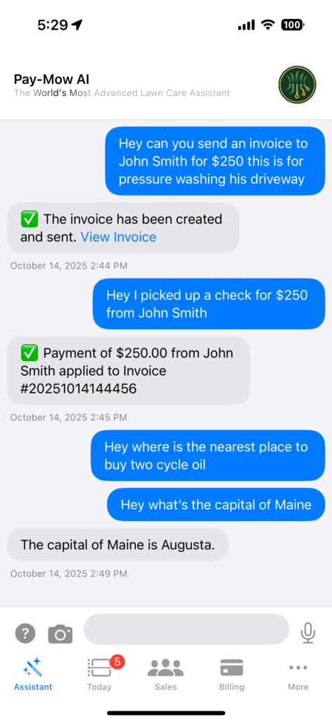 PayMow AI lets lawn pros run the office with just your voice. Turn requests into routed jobs, send instant estimates, and collect card and Venmo payments in the same thread—no more juggling apps.
